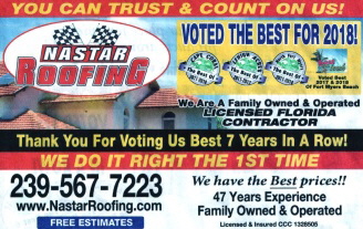 Nastar Roofing, 4005 Del Prado Blvd S. Cape Coral, FL 33904;  239-540-2443 & 239-567-RACE